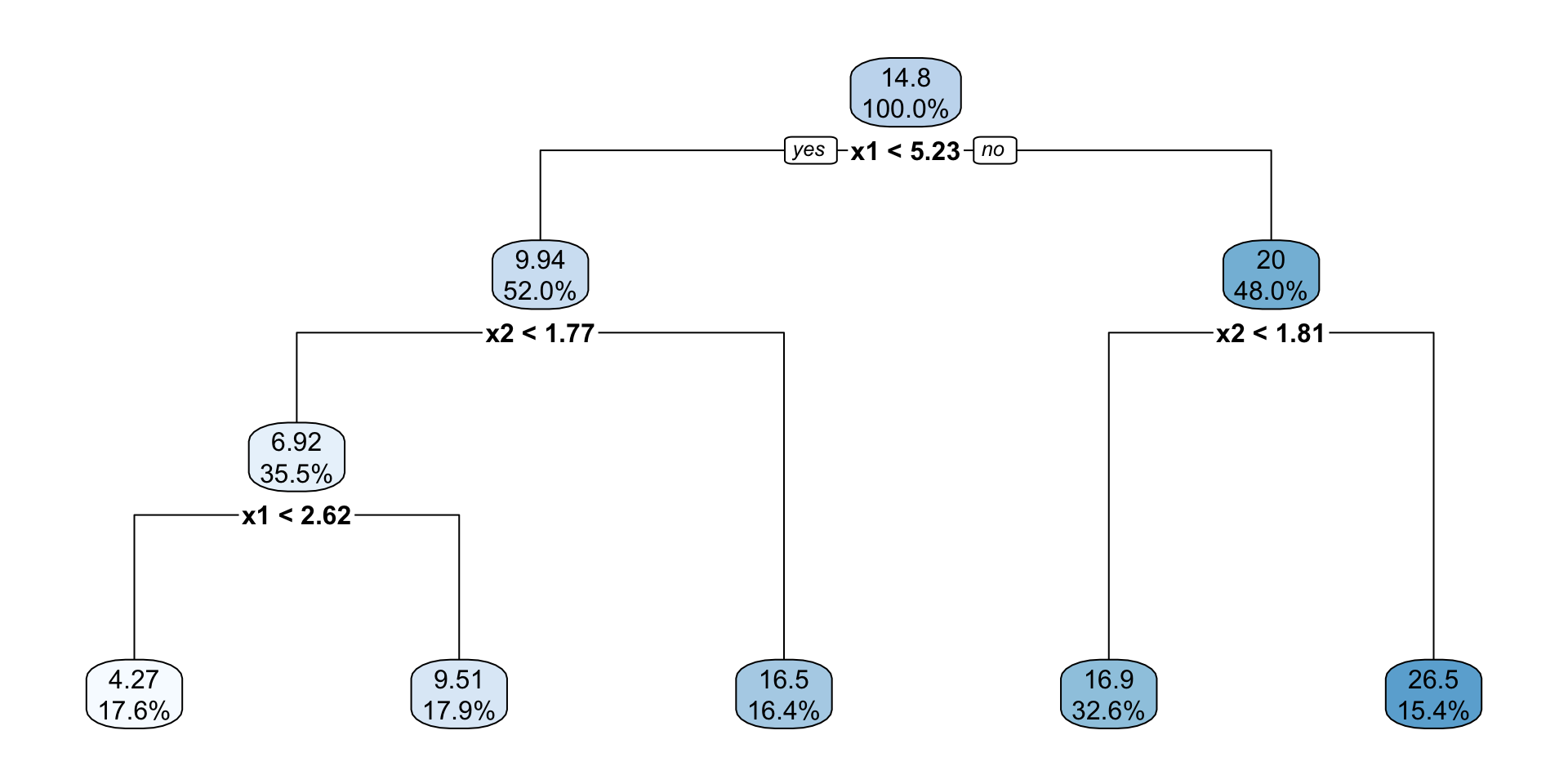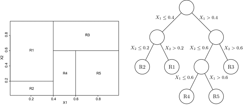 Classification and Regression Trees recursively divide the covariate space into two so that MSE decreases each time we add a partition. In the figure below, we have a partition with 5 leaves.