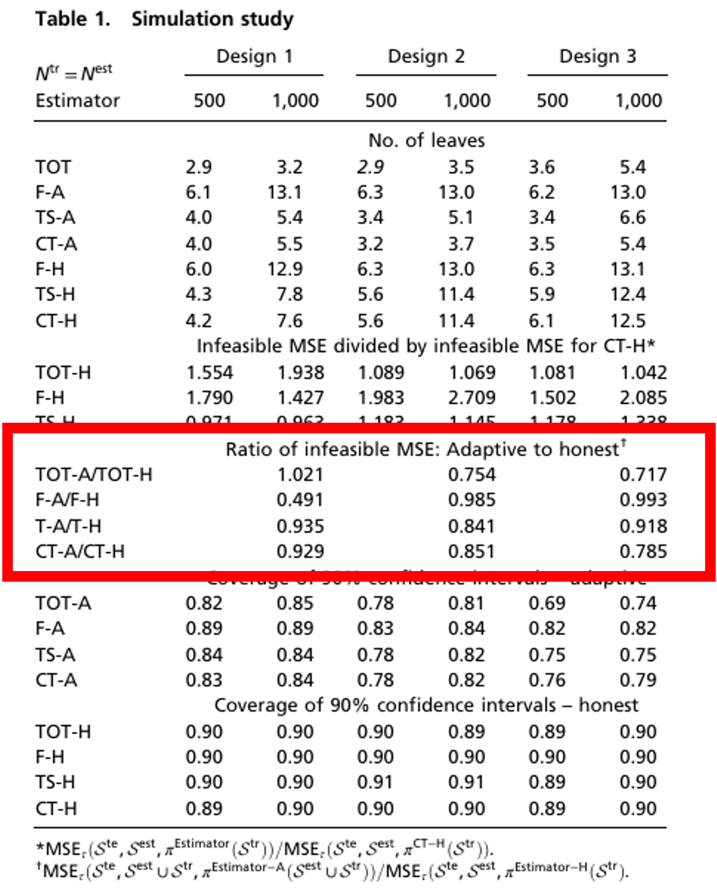 Honest estimation shows higher MSE in most cases \rightarrow Uses only half the data, leading to lower precision