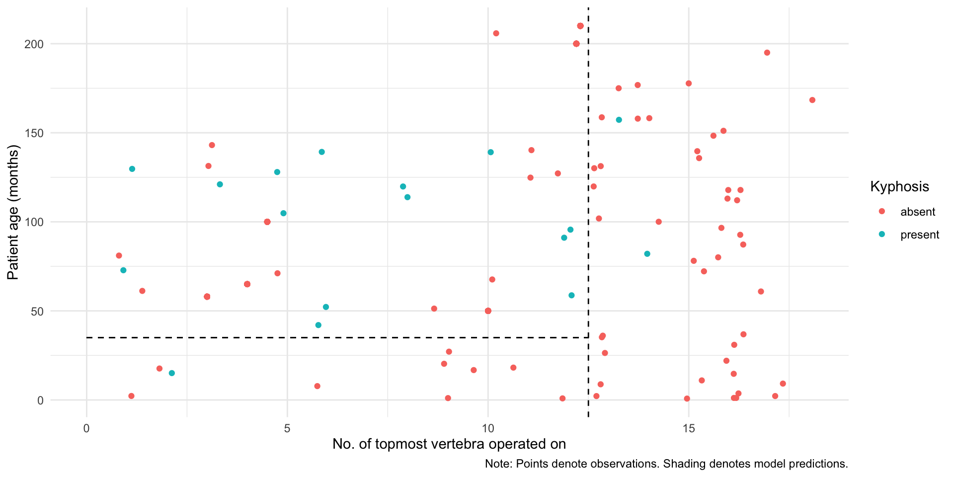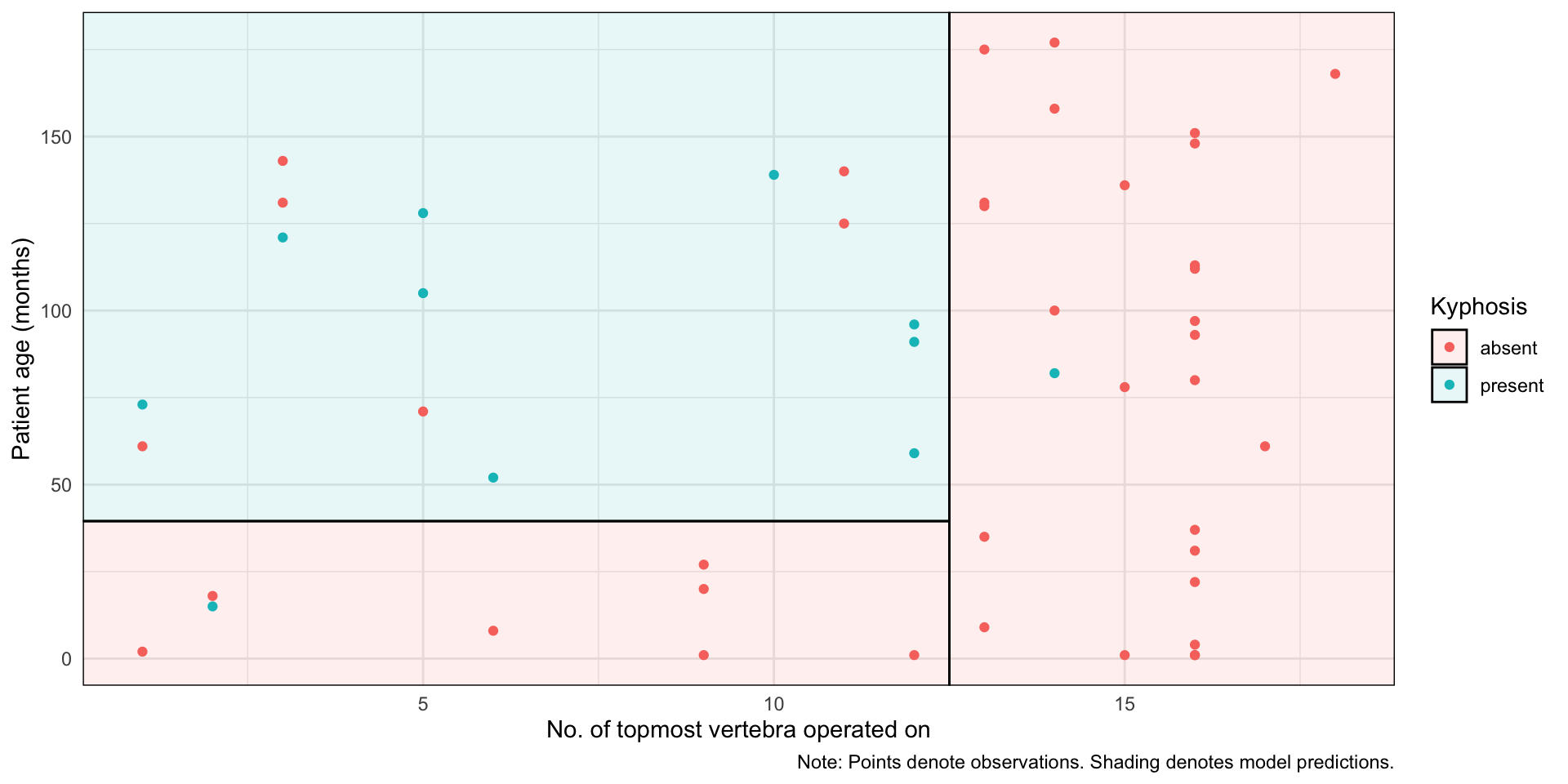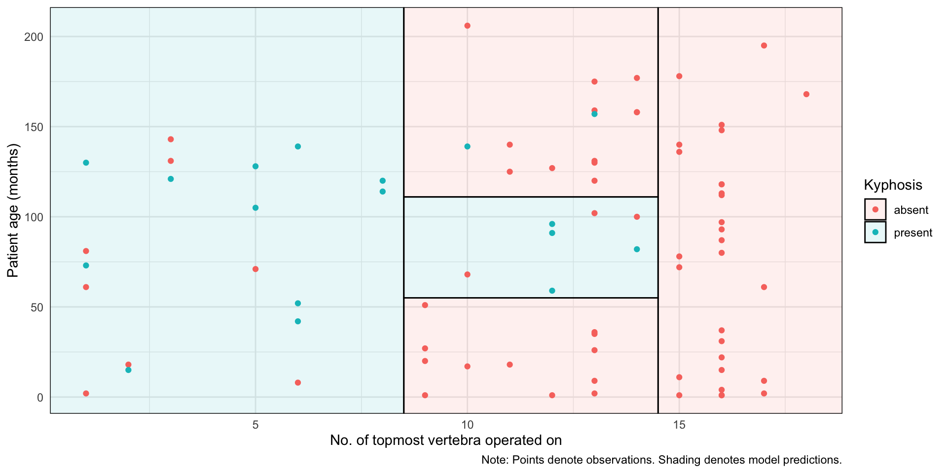 # See the full code at Grant Mcdermott's repositorylibrary(rpart) library(parsnip)library(tidyverse)library(parttree)set.seed(123) ## For consistent jitterfit =rpart(Kyphosis ~ Start + Age, data = kyphosis)ggplot(kyphosis, aes(x = Start, y = Age)) +geom_parttree(data = fit, alpha =0.1, aes(fill = Kyphosis)) +# <-- key layergeom_point(aes(col = Kyphosis)) +labs(x ="No. of topmost vertebra operated on", y ="Patient age (months)",caption ="Note: Points denote observations. Shading denotes model predictions." ) +theme_minimal()
